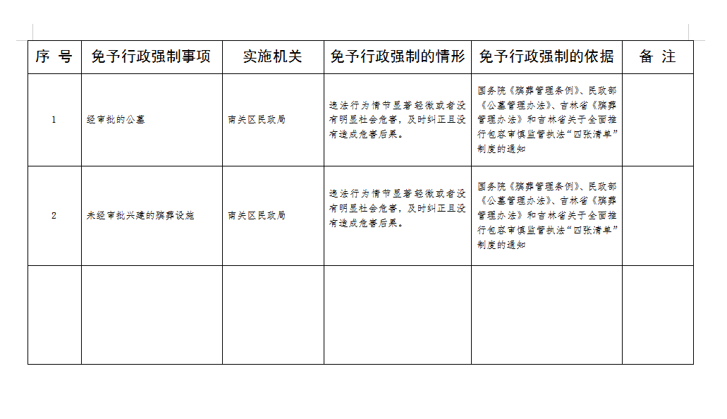 免予行政强制事项清单