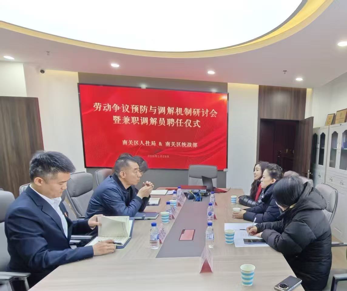 劳动关系和谐是经济社会高质量发展的重要基石,更是践行以人民为中心的发展思想、保障民生福祉、凝聚社会共识的关键支撑。为深化劳动争议源头治理,优化营商环境,切实维护劳动者与企业合法权益,1月23日,南关区委统战部副部长翟璐带领民进南关区基层委员会主委马雪菲一行,赴长春市南关区综治中心劳动维权保障服务区参观调研,并与南关区人社局就联合建立劳动争议预防及调解机制进行研讨。