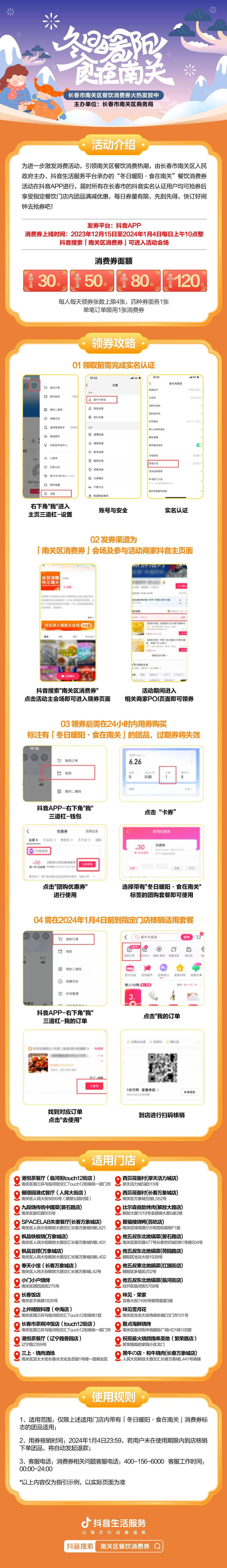 2.商家主页面领券:12月15日至2024年1月4日每天上午11点,用户需登录抖音app,搜索在南关区参与活动商户如港悦茶餐厅、俪璟园、九段烧、枫品、奉天小馆、SPACELAB失重餐厅等,点击进入商家页面即可领券并下单。 更多参与活动商家及地址请见尾部一页纸。